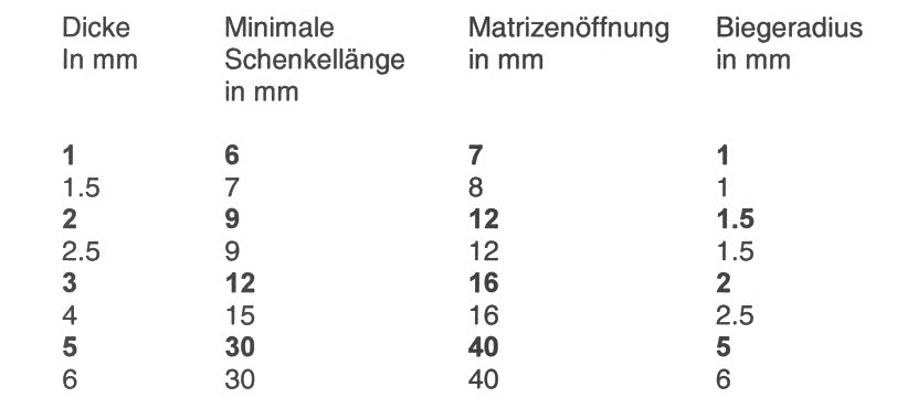 Die Radien in der Biegekante sind von der Matrizengrösse abhängig. Die Matrizengrösse hängt von der Materialdicke ab. Zum Berechnen des Innenradius gilt folgende Regel: